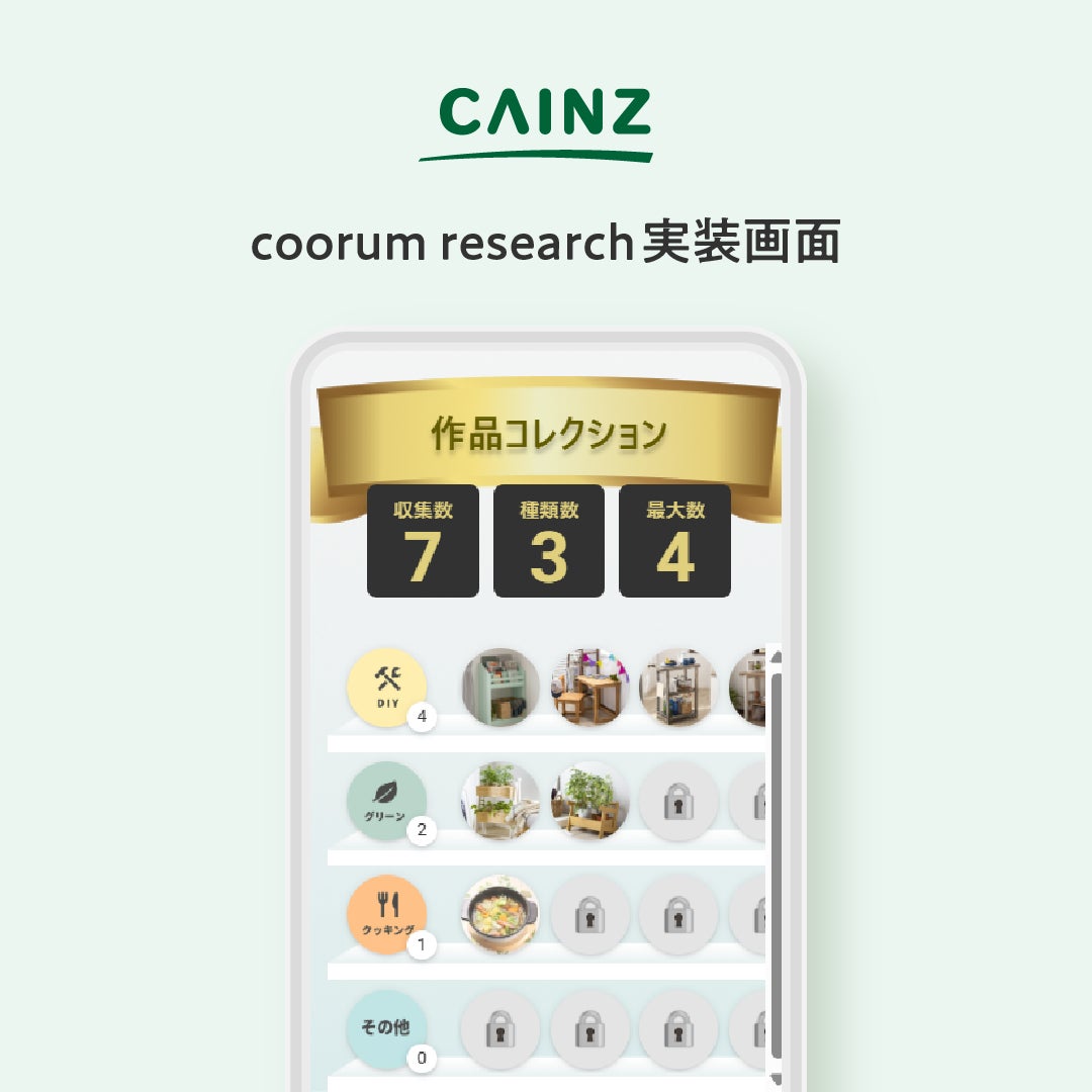 ユーザーが気軽に商品の購買やDIY作品の制作体験を記録できる「DIY Log」(Asobicaが提供するユーザーリサーチツール「coorum research」を活用)に、新たにコレクション図鑑機能とシェア機能が追加されました。この機能強化により、ユーザーは自身の活動を記録・整理しやすくなるだけでなく、お気に入りの作品をコミュニティに共有することで、ユーザー同士の新たなコミュニケーションのきっかけを生み出すことが可能になります。