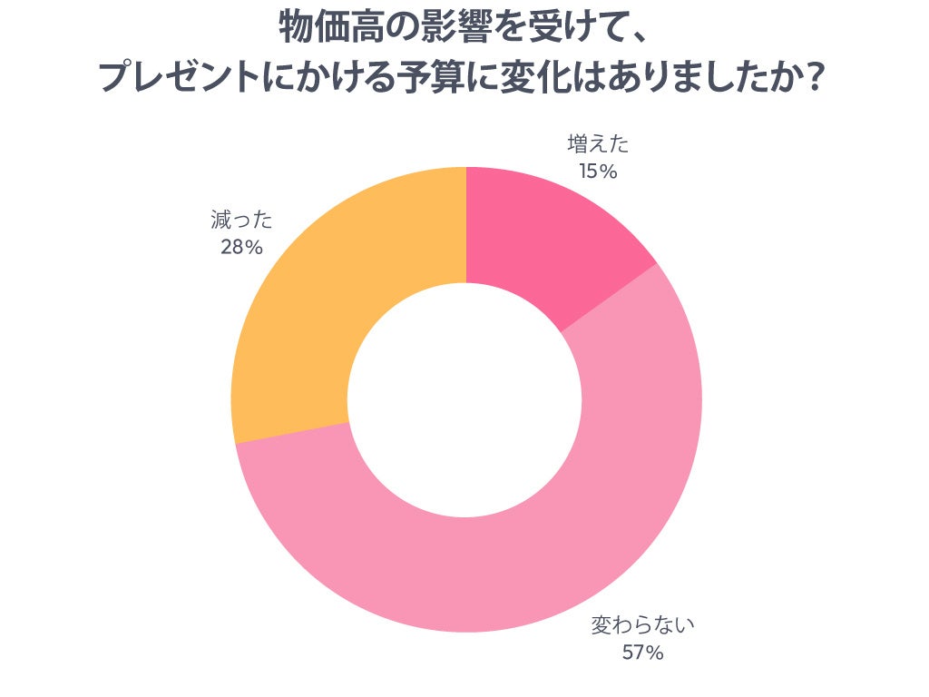 物価高の影響を受けても「予算は変わらない」と回答した人が57.0%と最も多かったものの、「減った」と答えた人が27.9%となり、「増えた」と答えた15.1%を大きく上回りました。この結果から、プレゼント選びにおいても支出を抑える消費行動が顕著になっていることが分かります。