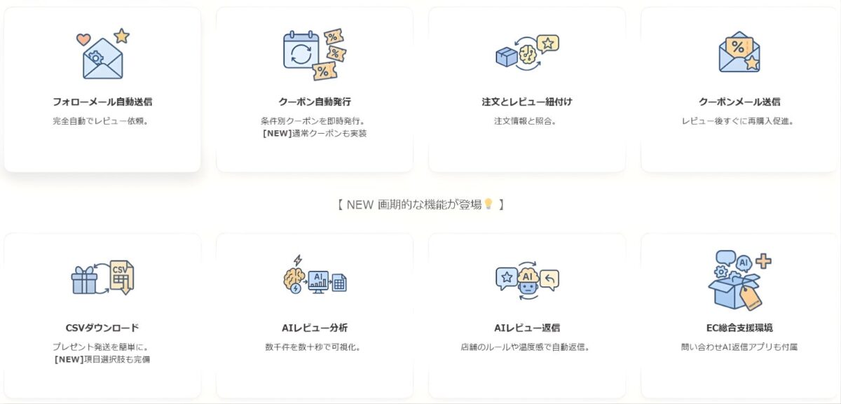 本サービスは、クーポン自動作成・発行、受注データとレビューの自動紐付け、そしてフォローメールやクーポンメールの自動送信を完全自動化し、EC運営の効率を劇的に向上させます。