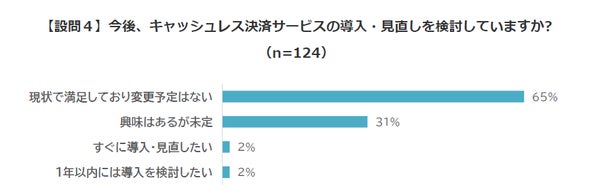 キャッシュレス決済サービスの導入・見直しに関しては、「現状で満足しており変更予定はない」と回答した店舗が最も多く、全体の65%を占めました。一方で、「興味はあるが未定」とした店舗も約3割に上り、新たなサービスへの関心が一定程度存在していることも明らかになりました。