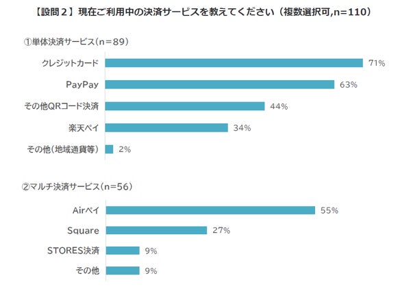 ※①と②のn数は、決済サービスを1つ以上選択した110件のうち、①単体決済サービスのいずれか1つ以上選択した件数(n=89)、②マルチ決済サービスのいずれか1つ以上選択した件数(n=56)と定義。割合はそれぞれのn数を母数に計算。