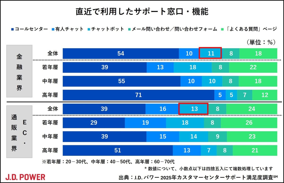 一方、60代から70代の高年層では、依然としてコールセンターが主要なチャネルとして定着しており、特に金融業界では直近で利用したチャネルの7割以上を占める結果となりました。