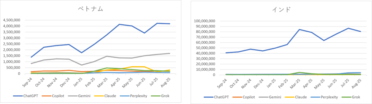 同調査によると、ベトナムではClaude、インドではPerplexityの検索ボリュームが急増した結果も見られるなど、国・地域ごとにおける注目度の差も明らかになっています。