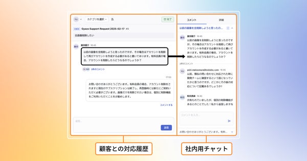 オペレーターが対応に迷う場合でも、対応履歴と紐づいた社内チャットから即座に相談できる機能を備えています。チャット画面上では、AIエージェントが過去の対応内容やナレッジを参照し、状況に応じて対応策を提案することも可能となっており、社内判断や連携をスピーディに進めることができます。