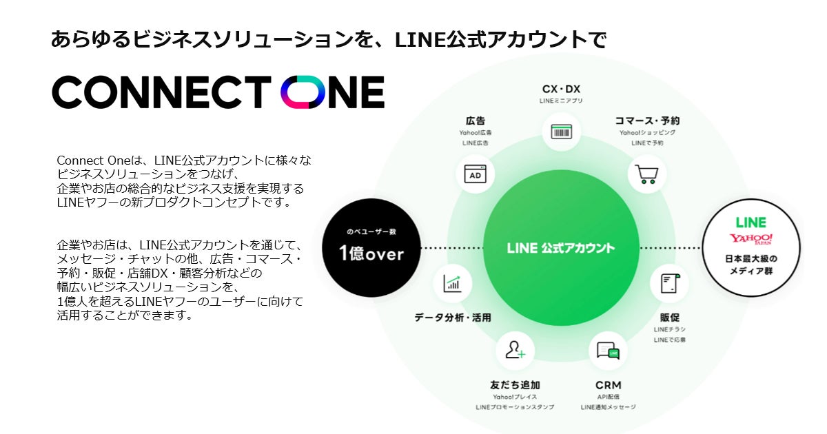 「Connect One」は、「LINE公式アカウント」に多様なビジネスソリューションを連携させ、企業や店舗の総合的なビジネス支援を実現するLINEヤフーの新しいプロダクトの概念です。企業や店舗は、「LINE公式アカウント」を通じてメッセージやチャットだけでなく、広告やコマース、予約、販促、店舗DX、顧客分析など様々なビジネスソリューションを、1億人以上のLINEヤフーのユーザーに向けてアプローチすることが可能です。