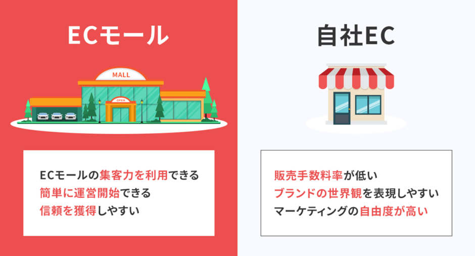 自社ECはブランドの世界観を自由に表現でき、CRM(顧客関係管理)やLTV(顧客生涯価値)の最大化に向いています。一方、モールECは集客力と露出の高さが魅力ですが、競争も激しく、価格訴求に引っ張られやすい面があります。両者の特性を理解し、戦略的に併用することが重要です。