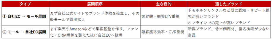 認知度が高く既存顧客を抱えるブランドは「自社EC→モール展開」が向いています。ドモホルンリンクルのように信頼とリピートを基盤とするブランドはこの形が理想です。