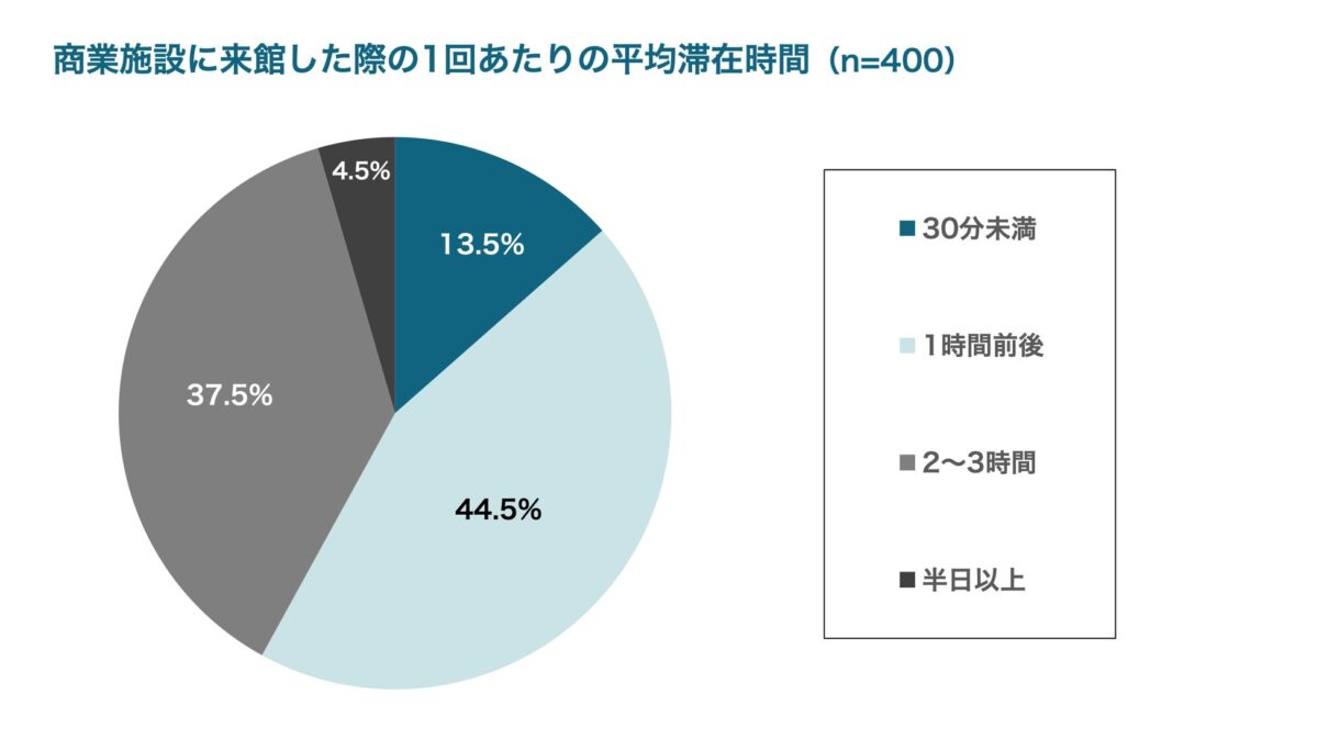 調査によると、Z世代の商業施設への来館頻度は「月2〜3回」が25.8%と最も高い割合を示しています。また、「月1回以上」("週1回以上"、"月2〜3回"、"月1回程度"の合計)となると74.1%にも達することが明らかになっています。平均滞在時間については「1時間前後」が44.5%で最多となっており、Z世代は"長時間滞在よりも効率"を重視し、必要な目的を短時間で済ませる行動傾向が顕著に表れているとのことです。