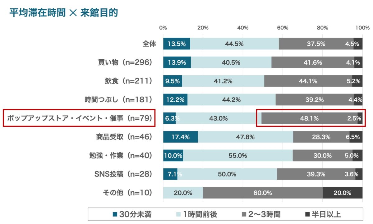 来館目的別に平均滞在時間を分析した結果、「ポップアップストア・イベント・催事」を目的とした来館は長時間滞在の割合が全体平均と比較しても相対的に高く("2〜3時間"、"半日以上"の合計)、体験を軸に"ゆっくり過ごす"傾向が明確に表れていることが示されています。一方、「買い物」は目的の幅が広いため、短時間での指名買いと長時間の買い回りの双方が混在する"二極型"の滞在パターンを示していることが明らかになりました。