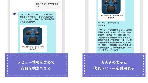 この連携によって、AIエージェントが利用できる情報が拡充され、商品提案時にレビュー情報を表示しながらの回答や、商品に寄せられたレビューを要約した回答の提供が可能になります。