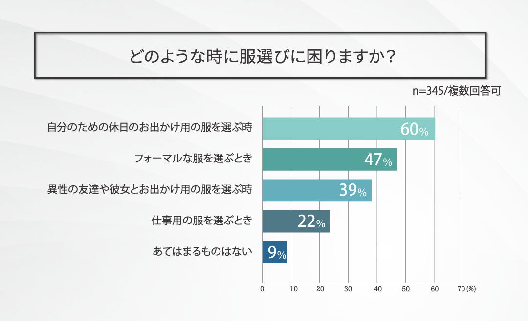 - 服選びに困るシチュエーションとして「自分のための休日のお出かけ用の服を選ぶ時」が最も多く挙げられています。