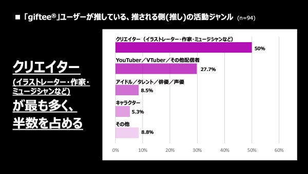 - 回答者のうち、「推される側」の活動内容やジャンルは、「クリエイター(イラストレーター・作家・ミュージシャンなど)」が最多の50%。YouTuber/VTuberなどの配信者が約28%と続きました