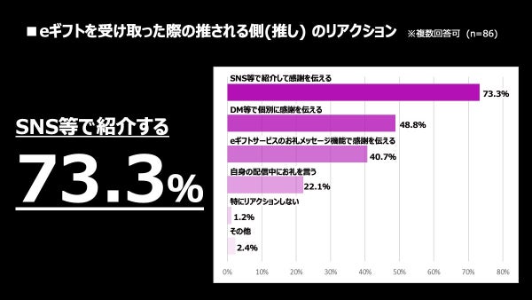 eギフトを受け取った際の「推される側」(推し)のリアクションとして、「SNS等で紹介して感謝を伝える」が約73%と最も多く、続いて「DM等で個別に感謝を伝える」(48.8%)「eギフトサービス内のお礼メッセージ機能を利用する」(40.7%)のほか、「お礼にイラストを描く」といった回答も見られました。