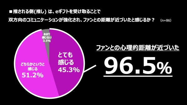 - eギフトをファンから受け取ることで、双方向のコミュニケーションが強化され、ファンとの距離が近づいたと実感した人は約97%と圧倒的な結果になっています