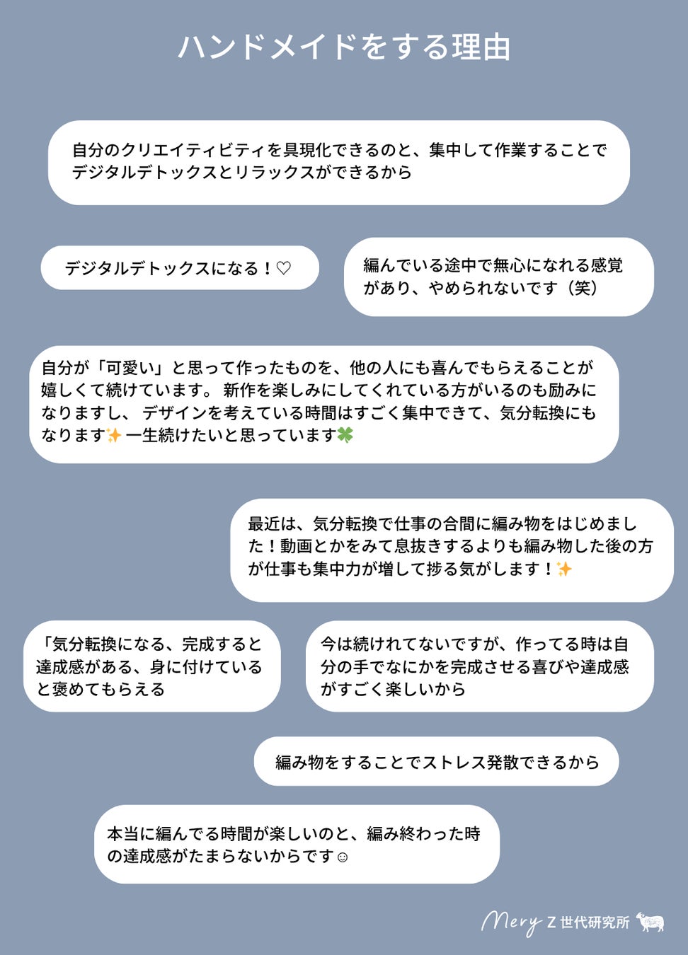 また、ハンドメイドを楽しむ理由として「達成感」や「デジタルデトックス」が挙げられていることは、デジタルネイティブ世代であるZ世代が、あえてアナログな手作り体験を通じて心の充足やリフレッシュを求めている点で興味深い発見です。