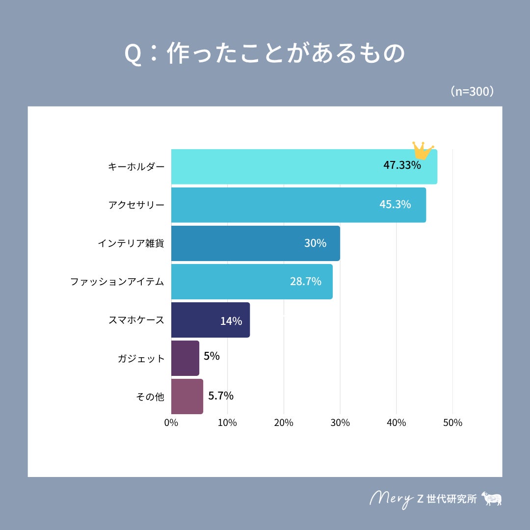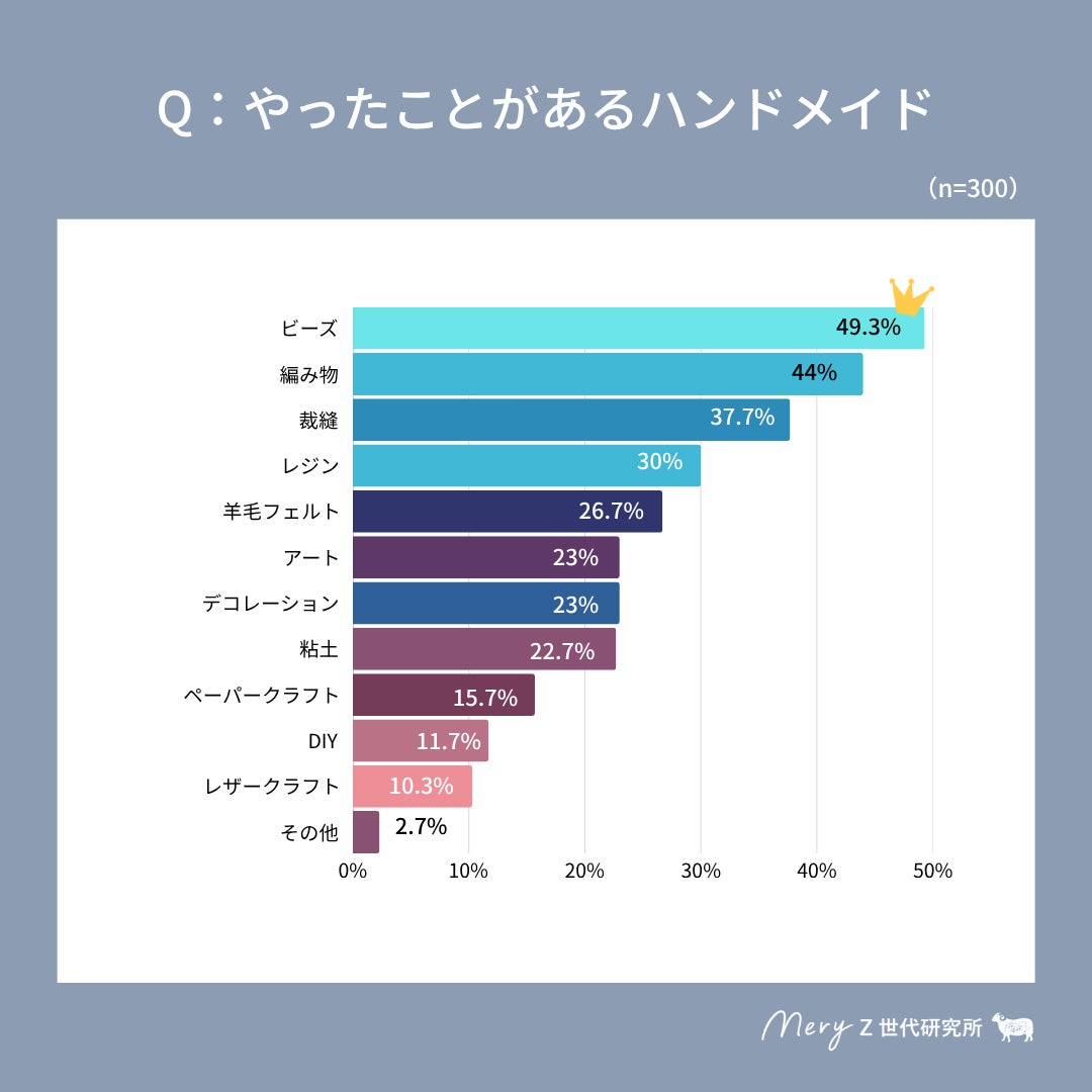 まず「ハンドメイドをやったことがあるか」という質問では、「日常的にやっている」「ときどきやっている」「やったことがある」と回答した方と、「やったことがないがやりたいと思っている」と回答した方を合わせると、全体の54.8%に達したとのことです。これにより、Z世代女性の半数以上がハンドメイド経験者またはハンドメイドに興味を持っていることが明らかになりました。