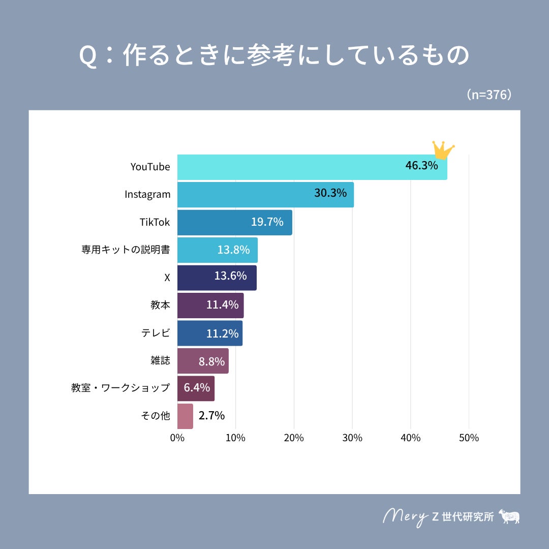 また、「作るときに参考にしているもの」についての質問でも、1位「YouTube」(46.3%)、2位「Instagram」(30.3%)、3位「TikTok」(19.7%)とSNSプラットフォームがトップ3を独占する結果となっています。