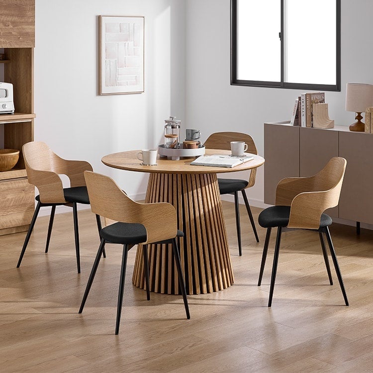 4人掛けセットで93,970円(税込)の円形ダイニングシリーズは、空間を格上げする和モダンな格子台座が特徴です。オークの天然木を使用した台座と、人気のラタン調デザインを採用したチェアの組み合わせが魅力。最近では顧客のリクエストに応えてブラックカラーも追加され、チェアも4種類の中から好みで選べるようパワーアップしています。