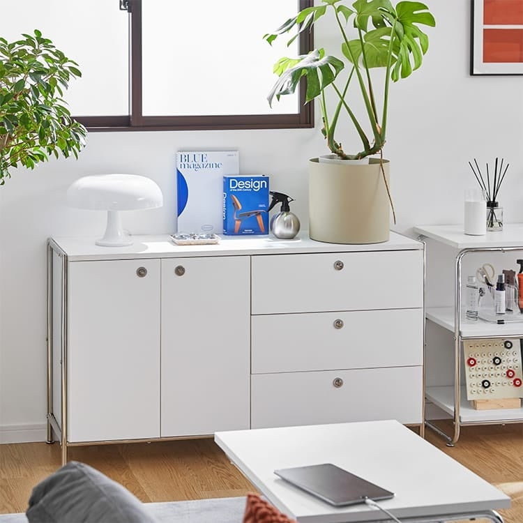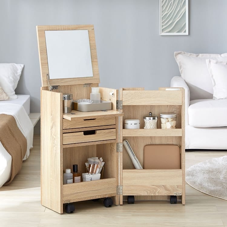 5畳の省スペースでも置ける、ドレッサーとワゴンが一体となった1つで2役の家具です。化粧品やメイク道具をスッキリ収納でき、天板の内側にミラーが付いているため、天板を開くだけでドレッサーに早変わり。手前の板を倒すことで物の取り出しやすさも向上し、メイク作業を快適にします。