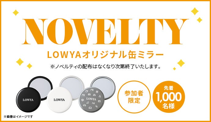 店頭でSNS投稿キャンペーンに参加すると、先着でホワイト/グレー/ブラックの3色から選べるLOWYAロゴ入り缶ミラーがプレゼントされます。