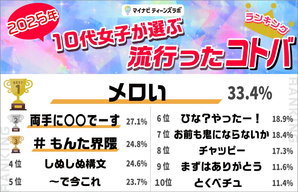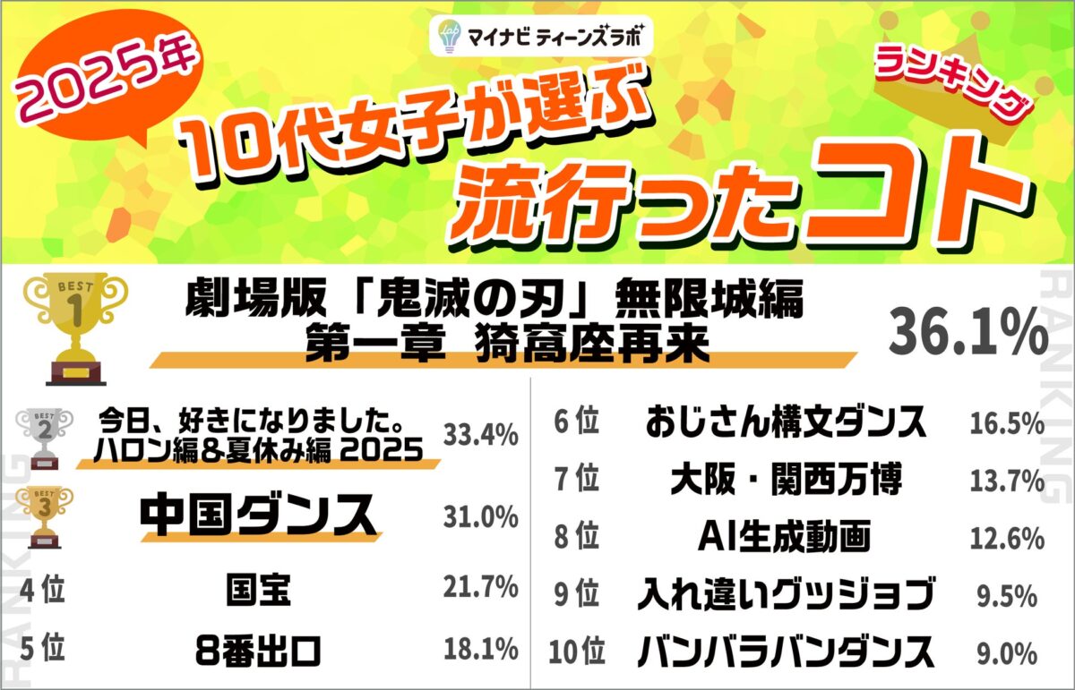 株式会社マイナビが運営する「マイナビティーンズラボ」が、10代女性を対象に実施した「2025年10代女子が選ぶトレンドランキング」の結果を発表しました。このランキングは、2025年に流行した「ヒト・コト・モノ・コトバ・ウタ」の5つのジャンルについて、13歳から19歳までの女性613名から回答を得て集計されたものです。2015年から始まったこの調査は、今年で11年目を迎えています。