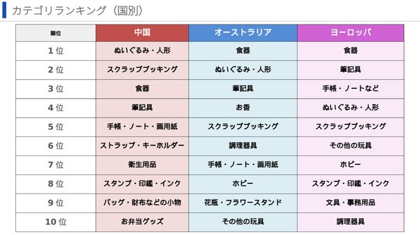 人気商品ランキング(国別)では、各国共通で「食器」と「筆記具」が上位ランクイン