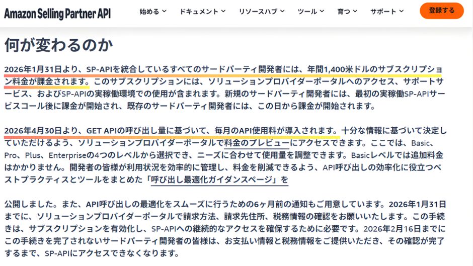 歴史を振り返れば、Amazonは2009年のMWS(SP-APIの前身)導入以来、約15年間もAPIアクセスを「無料」で提供してきました。 この無料利用も、2026年をもって完全に終焉を迎えます。これから2026年1月31日より年間サブスクリプション料、月次API利用料(従量課金)が同年4月30日から開始される予定です。(出典:Announcing SP-API subscription fees for third party developers starting January 31, 2026|developer.amazonservices.com)