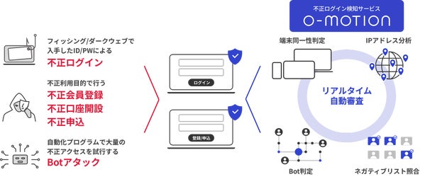 Caccoが提供する「O-MOTION」は、ログインや申込画面における不正ログイン、不正会員登録・口座開設、Bot攻撃などを検知・モニタリングするクラウド型サービスです。