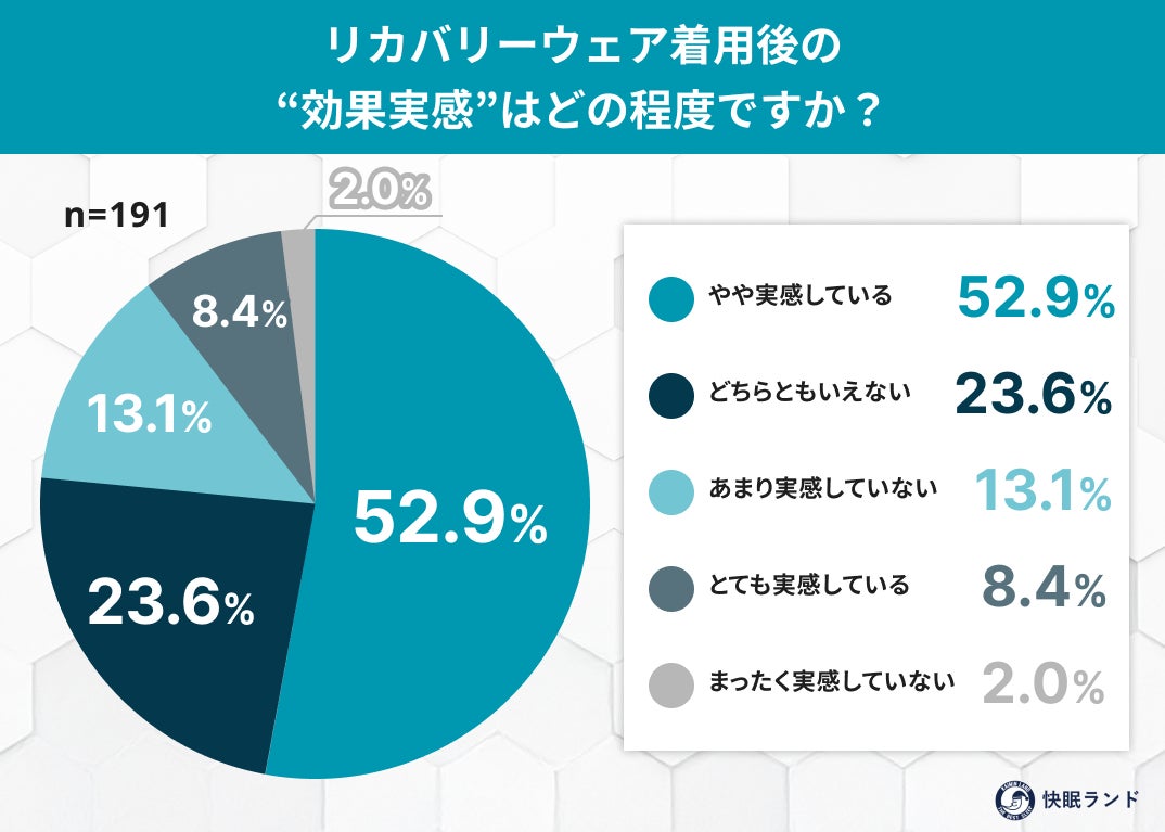 リカバリーウェアは以前、高価格帯の商品が中心でしたが、近年では1万円以下の手頃な商品が増加し、実際の効果や満足度への関心が高まっています。こうした状況を背景に、快眠グッズ紹介サイト「快眠ランド」を運営するムーンムーン株式会社は、1万円以下のリカバリーウェアを購入・着用した191名を対象とした調査を実施しました。調査結果によると、約7割の方が効果を実感し、半数以上が「価格以上の価値を感じた」と回答しています。