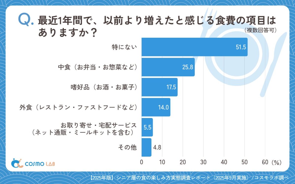食費の変化については「特にない」(51.5%)が最も多く、過半数は食費増を実感していないことがわかりました。一方で、「中食(お弁当・惣菜)」(25.8%)や「嗜好品(お酒・お菓子)」(17.5%)、「外食(レストラン・ファストフードなど)」(14.0%)は増加を感じている層が一定数存在しています。「お取り寄せ・宅配サービス(ネット通販・ミールキットを含む)」(5.5%)の増加も見られます。