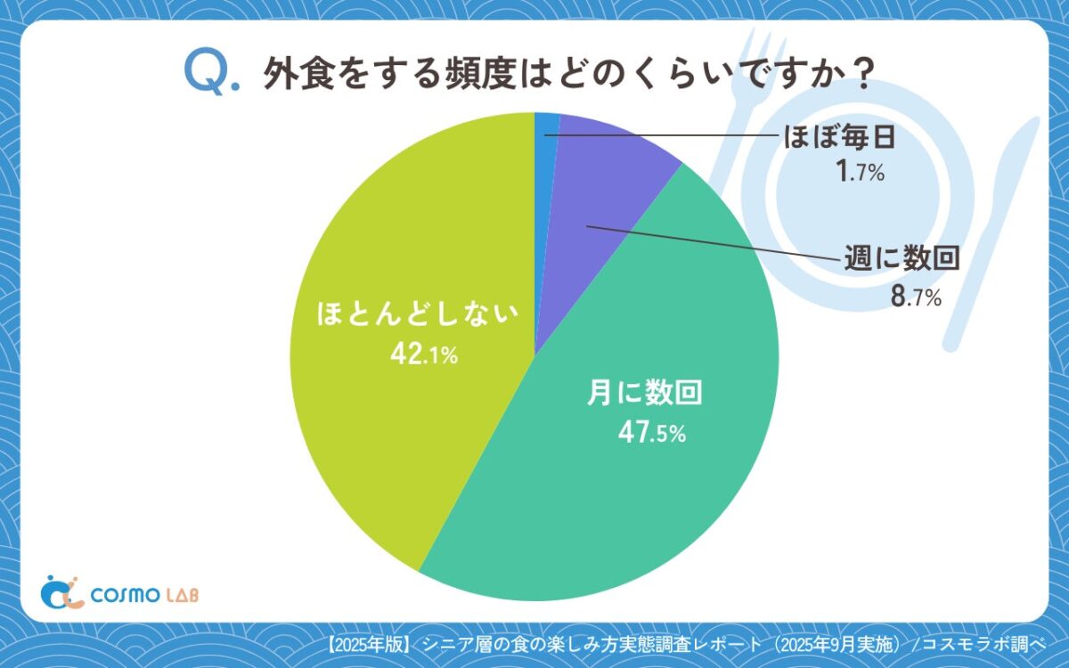 シニア専門のマーケティングプラットフォーム「コスモラボ」(運営:コスモヘルス株式会社、本社:東京都港区、代表取締役社長 小塚 崇史)が、50歳以上のシニア層を対象とした「食の楽しみ方」に関するアンケート調査結果を公開しています。本調査では、シニア層の生活状況、食事スタイル、食費の変化や健康志向、今後利用したいサービスなどについて詳細に分析し、シニア世代における食の楽しみ方や課題、将来のニーズを明らかにしています。