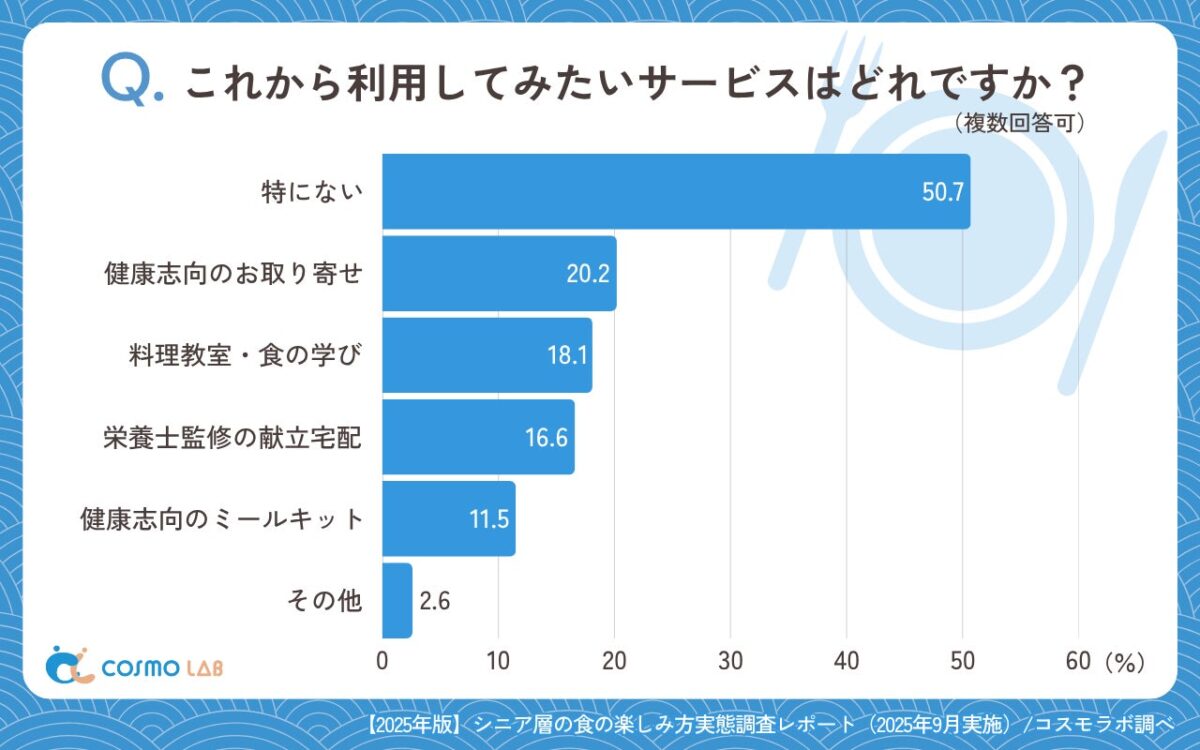 今後利用してみたいサービスについては、「特にない」(50.7%)が最も多く、約半数は現状の食生活に満足していることが示されました。一方で、「健康志向のお取り寄せ」(20.2%)や「料理教室・食の学び」(18.1%)、「栄養士監修の献立宅配」(16.6%)、「健康志向のミールキット」(11.5%)といったサービスが一定の支持を集めています。