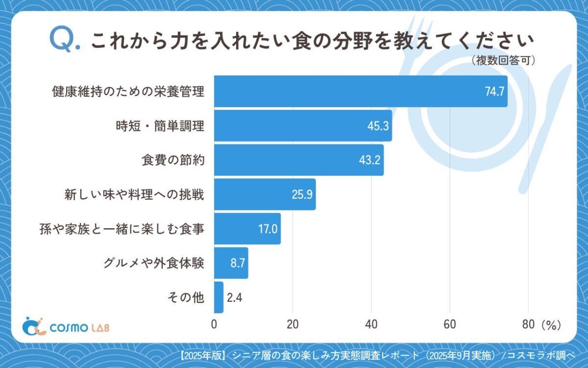 今後力を入れたい分野については、「健康維持のための栄養管理」(74.7%)が最も多く、健康志向が引き続き中心的なテーマとなることが明確になっています。「時短・簡単調理」(45.3%)や「食費の節約」(43.2%)も高い支持を集めており、効率性や経済性を重視する傾向も顕著です。