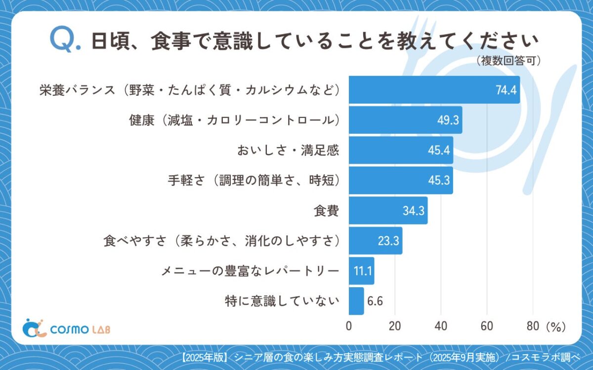 食事で意識していることについては、「栄養バランス(野菜・たんぱく質・カルシウムなど)」(74.4%)が最も多く、「健康(減塩・カロリーコントロール)」(49.3%)も約半数に達しており、健康維持に対する意識の高さが鮮明になっています。「おいしさ・満足感」(45.4%)や「手軽さ(調理の簡単さ、時短)」(45.3%)も同水準で重視されており、健康と楽しみ、利便性を同時に追求する傾向が見られます。