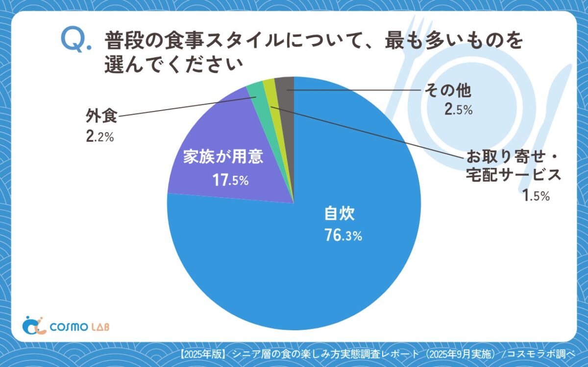 今回の調査から浮かび上がったシニア層の食生活の特徴は、「自炊中心」「健康志向」「節約と出費増の二極化」という3つの要素に集約されます。普段の食事スタイルでは「自炊」(76.3%)が圧倒的多数を占め、家族構成に応じた調理習慣が根付いていることが明らかになっています。