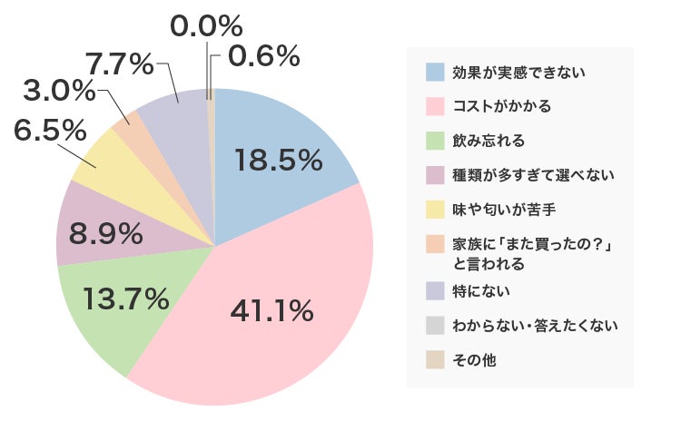 サプリメントの継続的な服用における最大の障壁としては、「コストがかかる」という経済的要因が全体の4割を占め、最も大きなハードルとなっていることが明らかになりました。