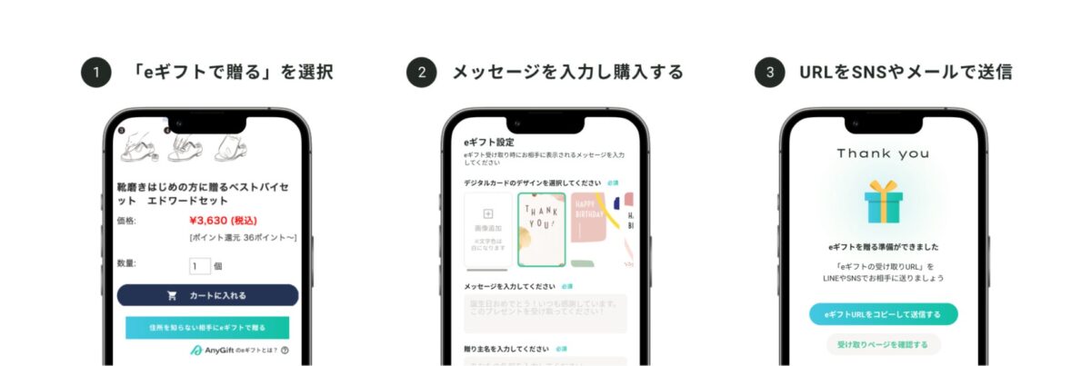 『AnyGift(エニーギフト)』は、相手の住所を知らなくてもLINEやメールで贈れる"eギフト機能"を自社ECサイトに組み込み・導入できるサービスです。