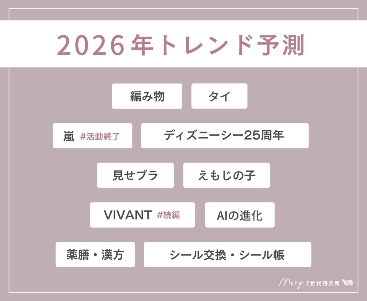また、MERY公式Instagramのストーリーズと編集部がピックアップした「2026年流行ると思うもの・こと」をもとに、気になるものについてアンケートが実施されました。アンケートの結果をもとに『2026年トレンド予測』が選定されています。