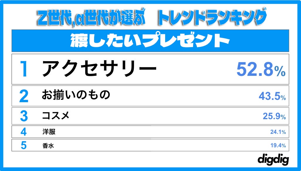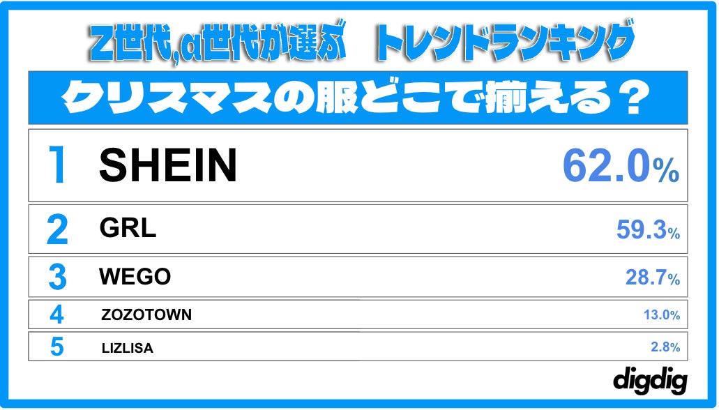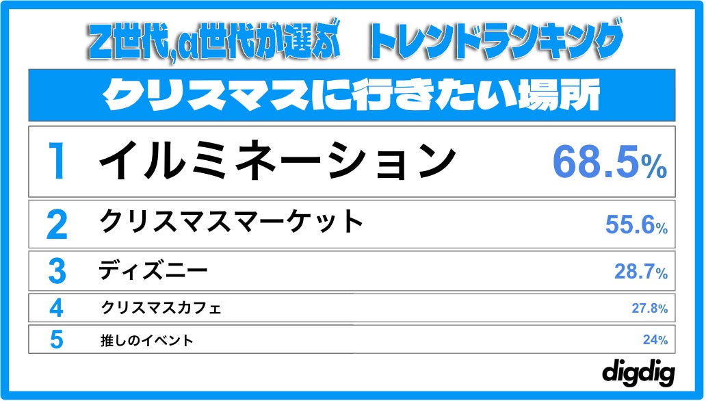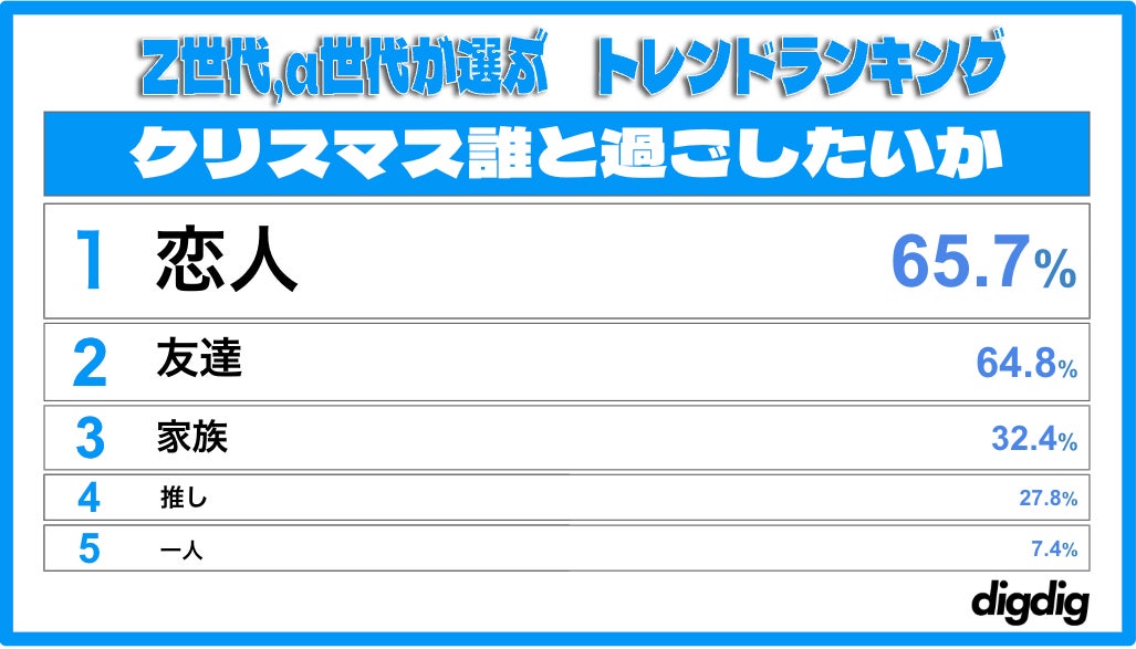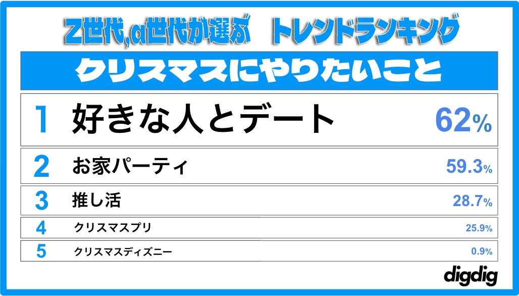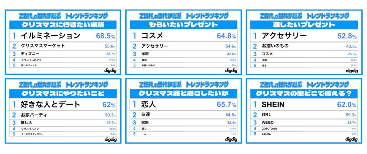 株式会社digdig(ディグディグ)が、同社が運営するメディアの読者を対象にトレンド調査を実施しました。この調査は特にZ世代およびα世代の女子を中心に行われ、彼らが選ぶ『Z世代・α世代が選ぶ2025クリスマストレンドランキング』が発表されました。