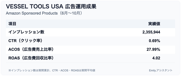 Amazon販売においては、単に商品を登録するだけでなく、適切な広告運用やコンテンツ制作、データ分析に基づく継続的な改善が重要です。Emily.アシスタントはこれらの業務を一気通貫でサポートすることで、VESSEL TOOLS U.S.A., Inc.の急速な成長を実現したと報告されています。