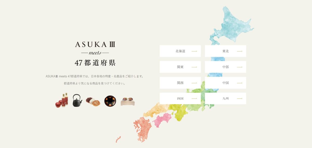 飛鳥クルーズ オンラインショップでは、「飛鳥Ⅲ」を通して日本全国の魅力をお伝えするプロジェクト「ASUKAⅢ meets 47都道府県」により、各都道府県の選りすぐりの逸品も購入可能です。