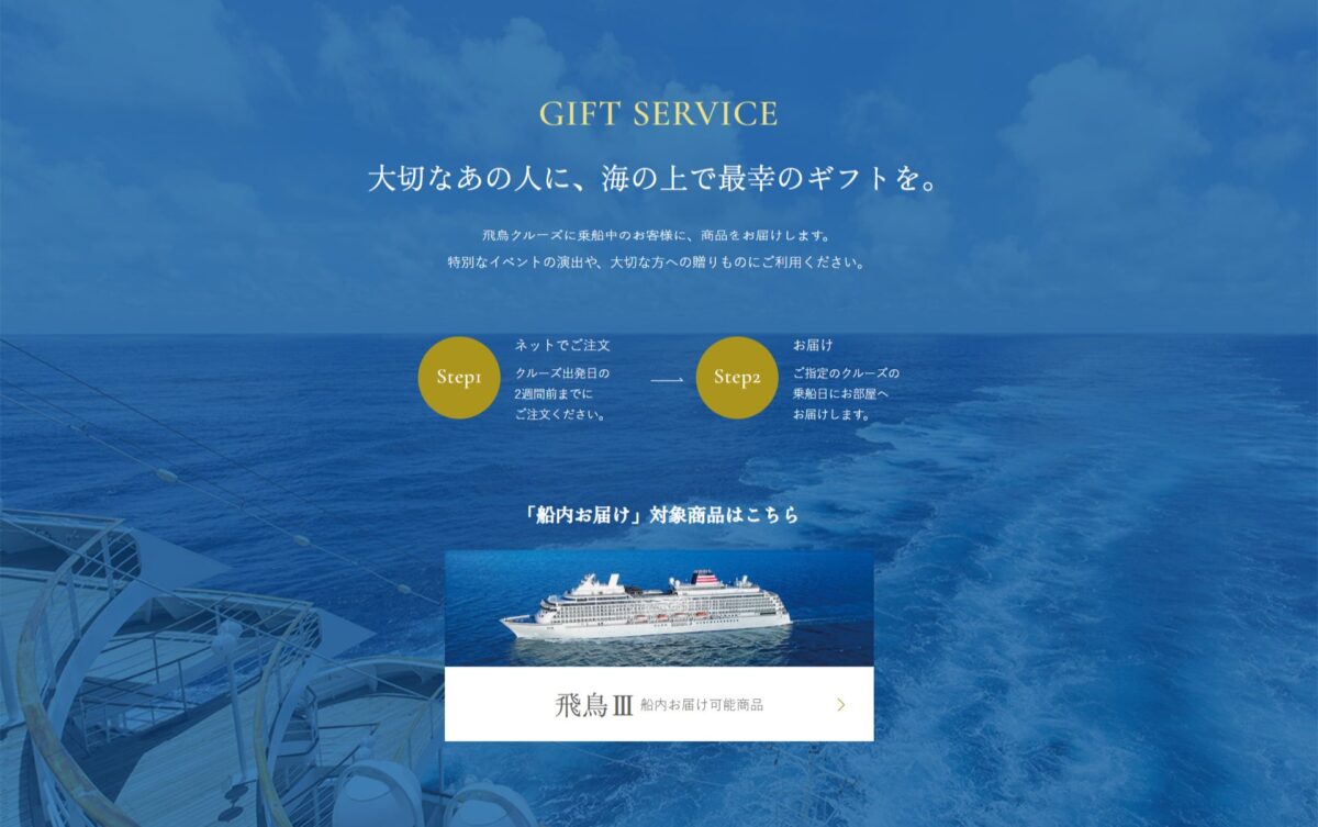 ご乗船されるお客様の"最幸の時間"を演出できるよう、飛鳥クルーズの乗船中にお部屋へお届けする「船内お届け」サービスにも対応しています。特別なイベントの演出や誕生日・アニバーサリーなど大切な方への贈りものとして、ギフトというかたちでお届けすることが可能となっているとのことです。