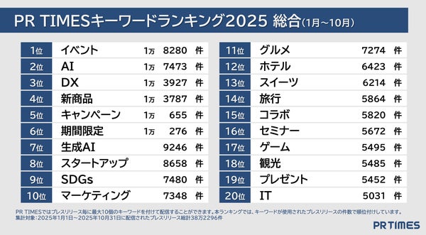 「PR TIMES」では、プレスリリース発表の際に企業が最大10個のキーワードを登録することができるとのことです。2025年1~10月に発表された総計38万2296件のプレスリリースには、46万7010種のキーワードが登録されていました。今回の分析では、件数による順位だけでなく、過去の件数との比較や月別の推移、キーワードごとの詳細な発表内容の分析から、2025年の企業活動の潮流や変遷、流行の兆しがキーワードを通して明らかにされています。