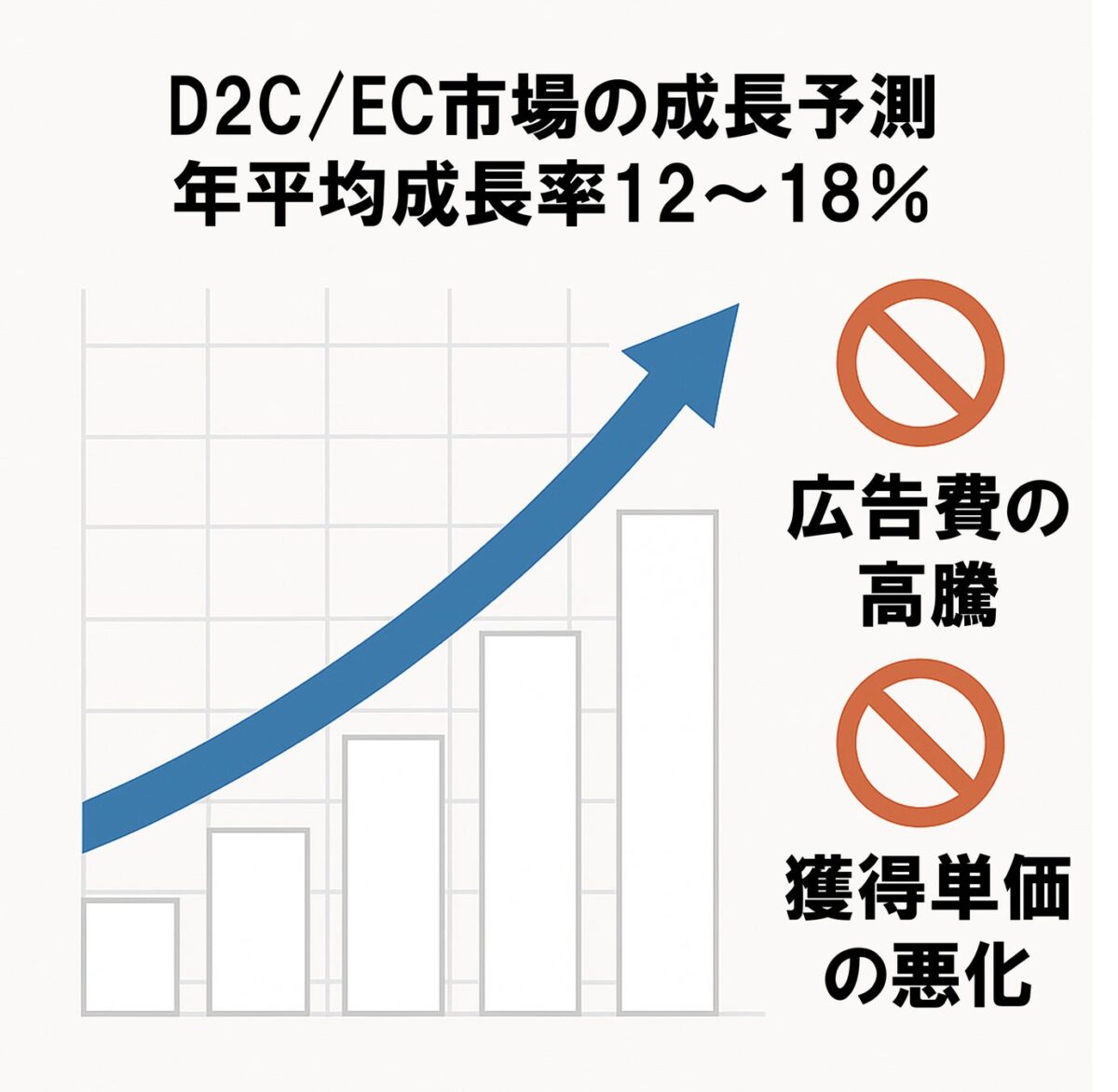 D2CおよびEC市場は調査機関による報告で年平均12〜18%の成長が期待されており、広告費の高騰や獲得単価の悪化が企業にとっての課題として浮上しています。この中で、広告の効率改善やLTV最大化は事業者の大きな経営課題となっています。