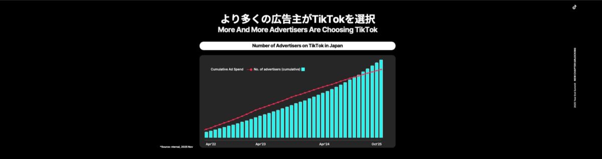 2025年は、イベントのキーメッセージである「New Chapter Unlocking」が示す通り、TikTokが日本のユーザーの日常に溶け込むプラットフォームとなるべく、様々なソリューションの提供やアップデートを進めてきたとのことです。これにより、ユーザー・企業・クリエイターがそれぞれの目標を達成できる"新章"が本格的に始動した一年となったと発表されています。