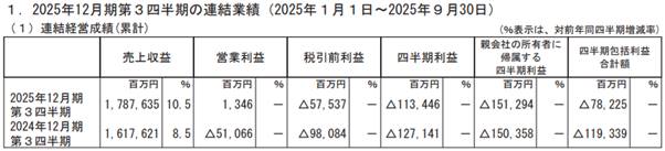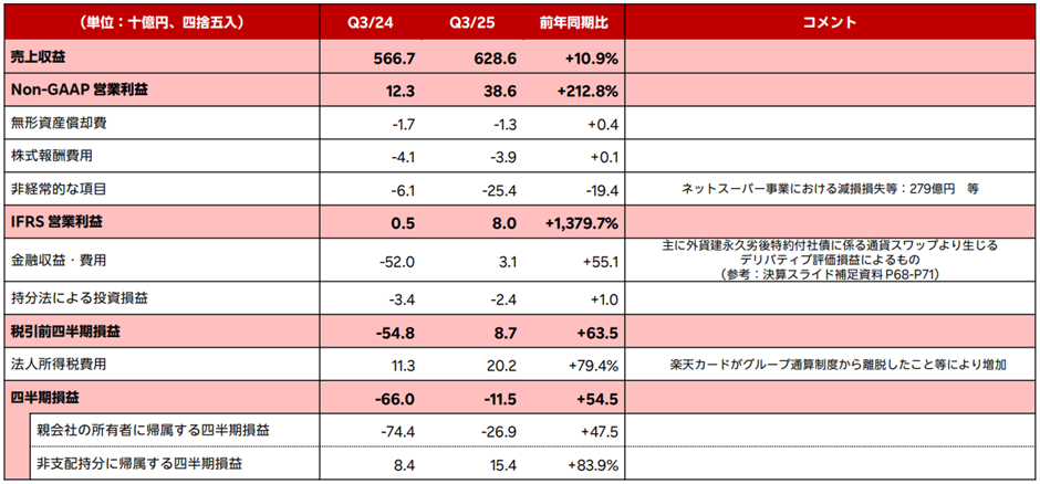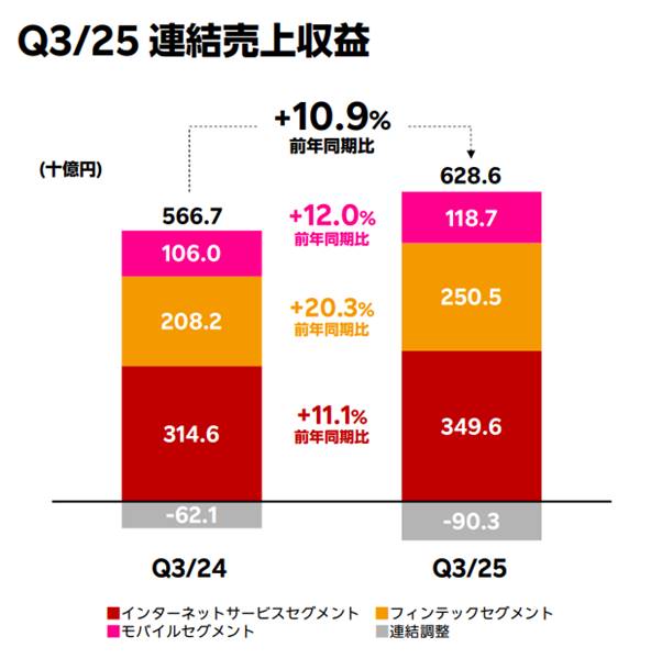 楽天グループの2025年1〜9月累計売上収益は1兆7,876億円(前年同期比+10.5%)と、2025年も継続的な成長を維持しました。とくにQ3単体での売上収益は6,286億円(前年同期比+10.9%)と、第二四半期から増速している点が特徴です。
