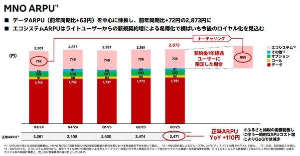 ARPU(1回線あたりの平均収益)はQ3で2,873円と前期比わずか+12円。