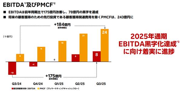 Q3終了時点のMNO契約は858万回線で、報道される「950万回線突破」はBCP(Business Continuity Planの略で、一部の法人向けサービス)を合算した数字のため、実態より膨らんで見えています。