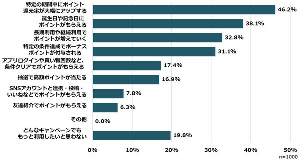 また、ポイントキャンペーンは半数以上(51.7%)の顧客の利用を喚起しており、特に「特定の期間中にポイント還元率が大幅にアップする」といった期間限定でお得感のあるキャンペーン(46.2%)が最大の利用促進要因であることが判明しました。