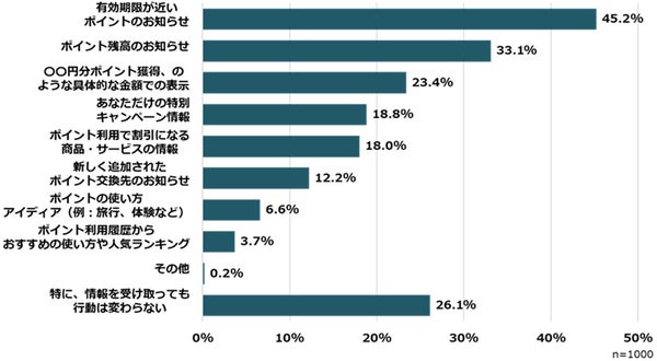 ポイントサービスで顧客の行動を促す情報については、「有効期限が近いポイントのお知らせ」(45.2%)が1位となり、期限切れによる損失回避が最も強い要因であることが明らかになりました。